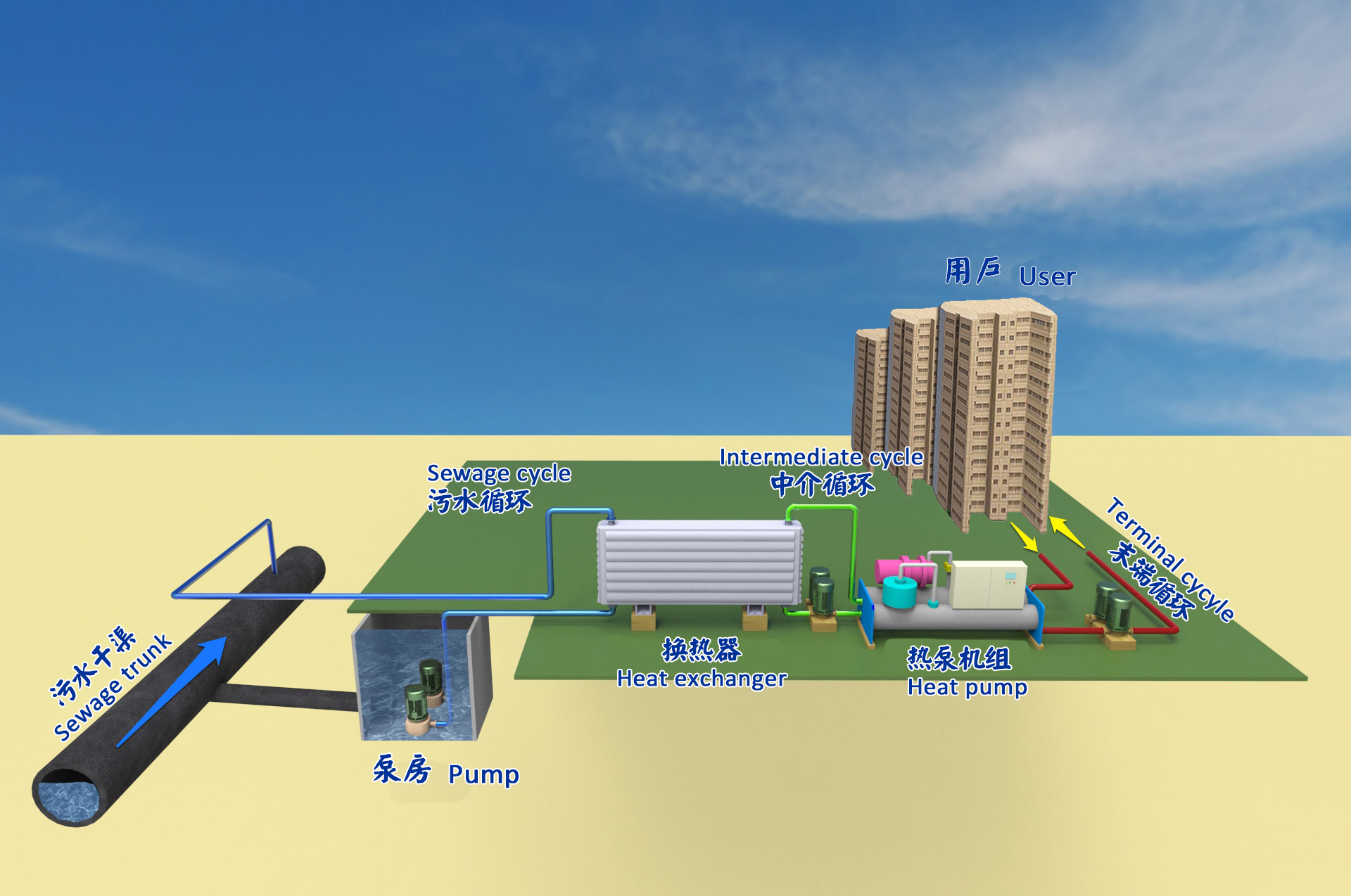 Sewage heat pump is using sewage as low-temperature heat source, through heat pump technology to extract and recycle the low-temperature energy of sewage to heating and cooling for buildings. The sewage includes unprocessed raw sewage, treated sewage.