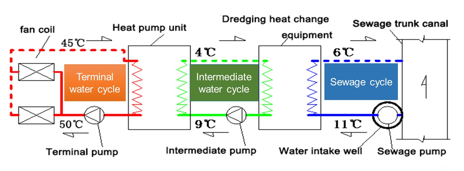 To deal with the water quality conditions of sewage or surface water, the current system adopts indirect heat pump system. First,The sewage passes the heat to the clean water(intermediate water), and the intermediate water enters the heat pump unit for cold and heat transformation. The sewage heat pump heating and cooling system is composed of three sub circulation systems, namely sewage circulation, intermediate circulation and terminal circulation. There is a heat pump working fluid (such as Freon) in the heat pump unit, which is the working process of heat pump unit, and it doesn't appear macroscopically. The main equipment of the system includes the sewage pump, the dredging heat exchanger, the intermediate pump, the heat pump unit and the terminal pump.