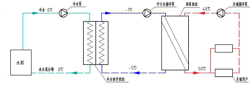 02 在中介水泵作用下,-5℃的中介水進(jìn)入冷水相變機(jī)組,吸收相變能后升為-1℃,再進(jìn)入熱泵機(jī)組,釋放出熱量后溫度降低,-5℃的中介水再次進(jìn)入冷水相變機(jī)組完成密閉循環(huán)。