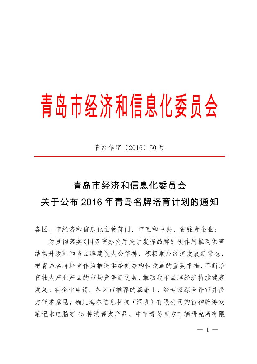 科創(chuàng)藍(lán)入選青島市2016年名牌培育計(jì)劃
