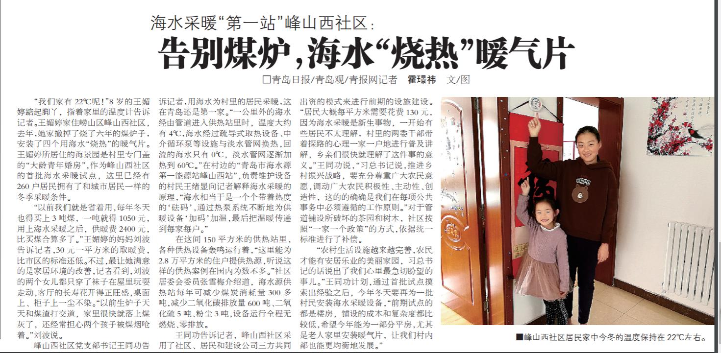 “我們家有 22℃呢!”8歲的王媚婷踮起腳丫,指著家里的溫度計告訴記者。王媚婷家住嶗山區(qū)峰山西社區(qū),去年,她家撤掉了燒了六年的煤爐子,安裝了四個用海水“燒熱”的暖氣片。王媚婷所居住的海景園是村里專門蓋的“大齡青年婚房”,作為峰山西社區(qū)的首批海水采暖試點,這里已經(jīng)有260戶居民擁有了和城市居民一樣的冬季采暖條件。